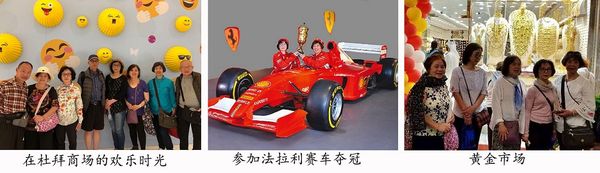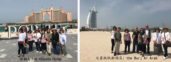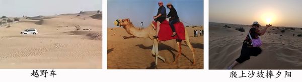 在杜拜,我们参加了2个自费项目,其一是乘船夜游杜拜河,包自助晚餐及文娱表演,每人消费150 Dirham ($40.84). 其二是游沙漠野生动物园,含骑骆驼,坐越野车,滑沙,晚餐兼看节目每人消费140 Dirham ($38.12),其中最惊险刺激的是越野车,没繫安全带,连司机5人共乘一辆SUV在辽阔的沙丘上奔驰,车速极快,忽左忽右,忽上忽下,车子抛上抛下,或极度倾斜前进,我们死命地抓紧车上的把手,紧闭双眼,肚里的内脏似乎在翻滚,几乎有肝裂肠断的感觉。这一体验,此生无憾。