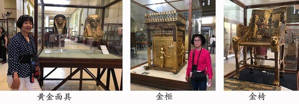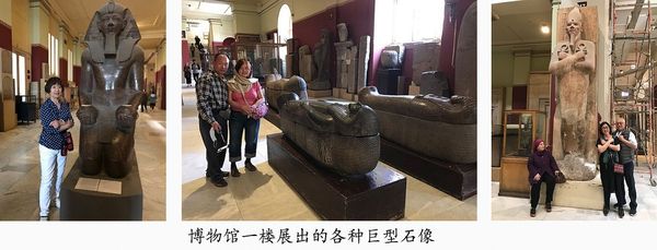 埃及博物馆里留存着的是人类最古老的文明,博物馆共分两层,下层展出从古王国时期到罗马时期的古物,有很多大型石像、石棺和石刻等;上层根据主题分成不同展区,有木乃伊、棺椁、法老的黄金面具、黄金床、黄金椅、黄金杖和很多较小型的展品。 数以万计的展出文物,我们只能走马看花大约领略埃及的古文化。