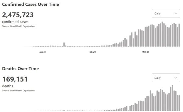 根据世卫组织最新实时统计数据,目前全球确诊新冠肺炎2475723例,死亡169151例。