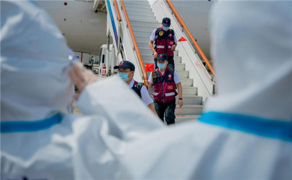 昆明出入境边防检查站为中国赴缅甸抗疫医疗专家组提供便捷通关服务(庄兴 摄)