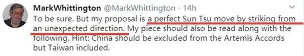 惠廷顿解释,这样做,不仅可以打击中国人想要登上月球、“称霸”太空的“野心”,还可以向中国“证明”,美国及其盟友不会这么轻易被打倒,从而让中国“在精神和经济上双重受挫”,让中国为“隐瞒”疫情付出“代价”。