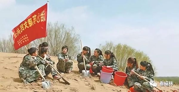 榆林市榆阳区补浪河乡治沙女民兵连的队员们在修剪树枝 刘继远 摄