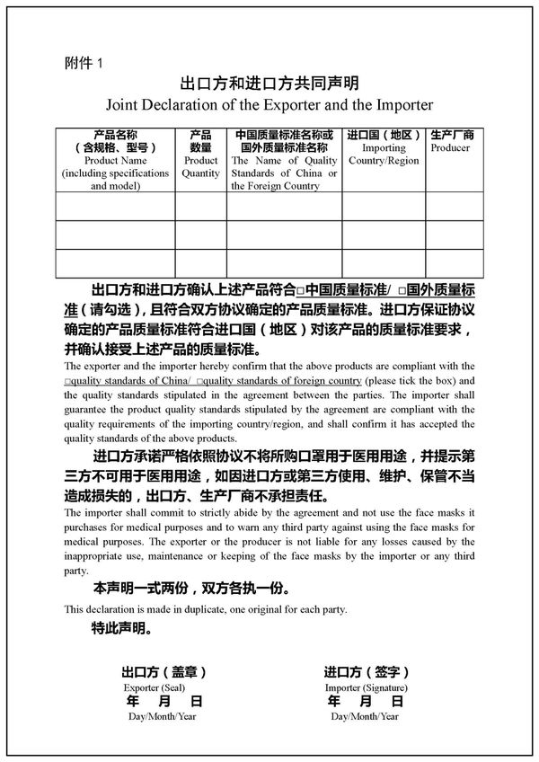 商务部确认取得国外标准认证或注册的非医用口罩生产企业清单(中国医药保健品进出口商会网站www.cccmhpie.org.cn动态更新),市场监管总局提供国内市场查处的非医用口罩质量不合格产品和企业清单(市场监管总局网站www.samr.gov.cn动态更新),非医用口罩出口企业报关时须提交电子或书面的出口方和进口方共同声明(参考附件1),确认产品符合中国质量标准或国外质量标准,进口方接受所购产品质量标准且不用于医用用途,海关凭商务部提供的企业清单验放,对不在市场监管总局提供的企业清单内的,海关接受申报,予以验放。