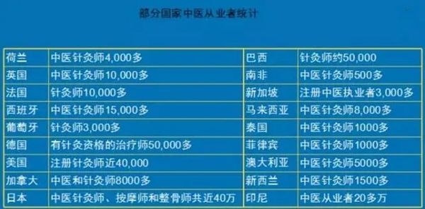 在国外,中医针灸师非常受欢迎,收入也非常高。这几年,随着中医药“一带一路”的推动发展,国内每年有大量的中医在全世界开展着中医药的交流发展工作。