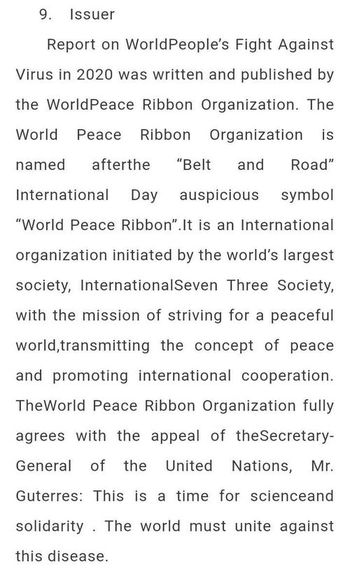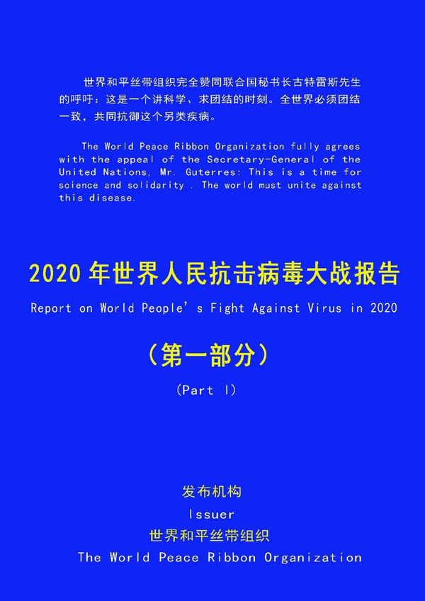 《2020年世界人民抗击病毒大战报告》由世界和平丝带组织撰写并发布。世界和平丝带组织以“一带一路”国际日吉祥信物“世界和平丝带”命名,以争取和平世界、传递和平理念,促进国际合作为己任,由全球第一大学社——七三国际学社倡议发起的国际组织。世界和平丝带组织完全赞同联合国秘书长古特雷斯先生的呼吁:这是一个讲科学、求团结的时刻。全世界必须团结一致,共同抗御这个另类疾病。