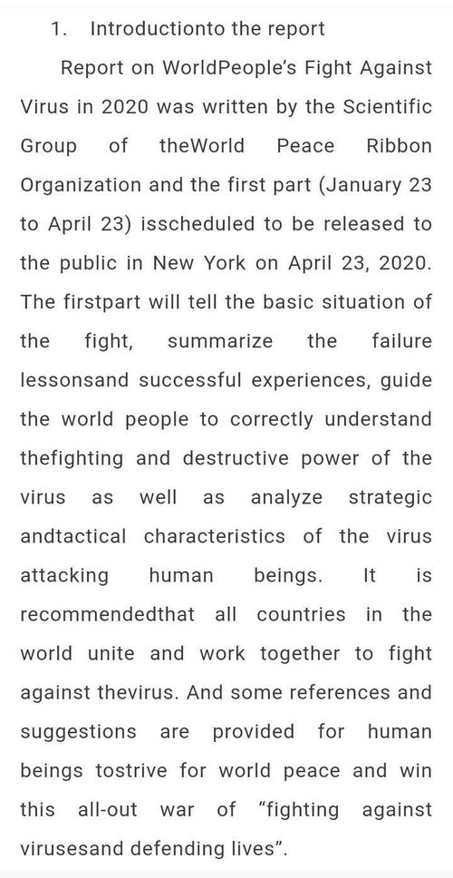 《2020年世界人民抗击病毒大战报告》由世界和平丝带组织科学组撰写,定于2020年4月23日在纽约向全球公开发布第一部分(1月23日至4月23日)报告内容,讲述这场世界人民抗击病毒大战的基本情况,总结失败教训与成功经验,引导世界人民正确认识病毒的战斗力和破坏力,剖析病毒进攻人类的战略战术特点,倡议世界各国团结协作、共同对敌,为人类争取世界和平,打赢这场“抗击病毒、捍卫生命”的全面战争,提供参考建议。