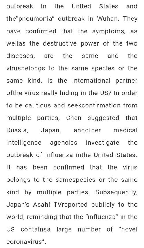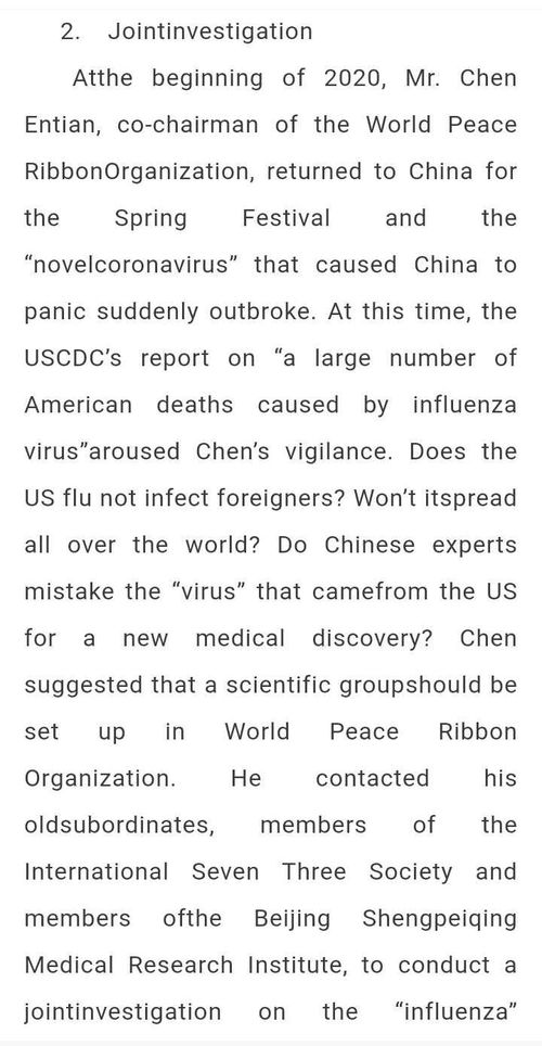 2020年初,世界和平丝带组织联席主席陈恩田先生回到中国过春节,一场令中国惶恐不安的“新冠病毒”事件突然降临。就在这时,美国疾控中心关于“病毒流感导致大量美国人死亡的报告”引起了陈恩田的警觉。美国流感不传染外国人吗?不会传播到世界各地吗?难道中国专家错把从美国流窜过来作案的“病毒”当作医学新发现新成果?陈恩田建议世界和平丝带组织成立科学组,并调动自己的老部下——国际七三学社的成员和北京圣佩清医学研究院的成员,对在美国爆发的“流感”和在武汉爆发的“肺炎”进行并案调查,从而证实两种疾病症状相同,破坏力相同,病毒属于同种或同类,“坏蛋”的国际同伙真的暗藏在美国吗?本着慎重起见,以求多方证实,陈恩田建议俄罗斯、日本等医学情报机关对美国爆发的“流感”进行调查,多方证实病毒属于同种或同类。随后,日本朝日电视台向全球公开报道,提醒美国爆发的“流感”中含有大量“新冠”。
