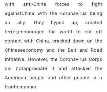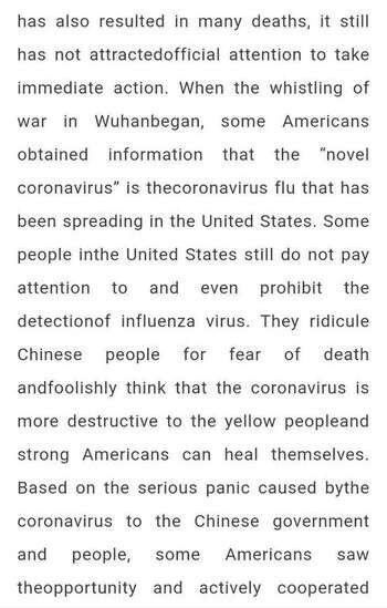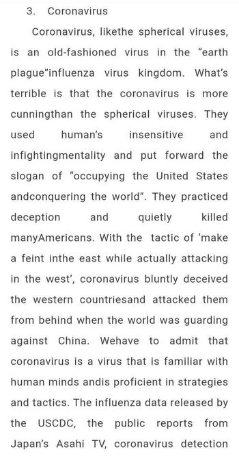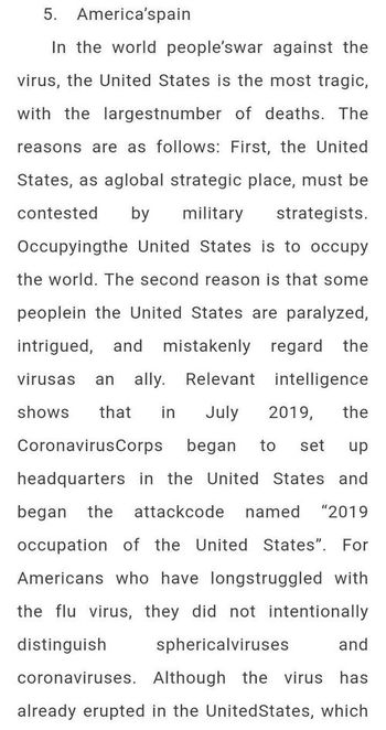 这场世界人民抗击病毒的战争,美国最为惨烈,战死人数最多。究其原因,一是美国作为全球战略要地,兵家必争,占领美国就是占领世界;二是美国某些人麻痹大意、勾心斗角,错把病毒当盟友。有关情报显示,从2019年7月,冠状病毒军团开始在美国安营扎寨,开始了代号为“2019占领美国”的袭击行动。对于长期和流感病毒作斗争的美国人民来说,他们并没刻意区分球状病毒和冠状病毒。虽然病毒早已在美国爆发,也导致很多人战死,依然没有引起官方重视并全力阻击。直到武汉吹哨战打响,美国某些人获取的情报显示,祸乱中国的“新冠肺炎”就是早已在美国流行的冠状病毒流感,美国某些人仍然不予重视,甚至禁止对流感病毒进行检测,嘲笑中国人是怕死的东亚病夫,认为冠状病毒对黄种人更有杀伤力,强壮的美国人可以不治自愈。基于冠状病毒给中国政府和人民造成的严重恐慌,美国某些人眼见落井下石的时机来到,积极配合反华势力,以冠状病毒为盟友,共同对付中国,他们大肆炒作,制造恐怖,怂恿世界与中国断绝往来,打击中国经济及一带一路合作倡议。然而,冠状病毒军团并不领情,背后疯狂地攻击美国人民和其他国家人民。