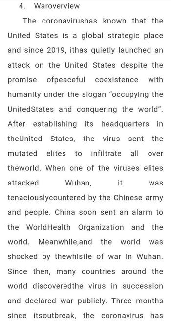 2019年以来,冠状病毒深知美国是全球战略要地,在“占领美国、攻陷世界”的口号下,不顾与人类和平共处的约定,悄然对美国发动袭击。病毒在美国建立总部后,派出变异精锐病毒潜入世界各地,其中一支病毒在进攻武汉时,遭到中国军民顽强反击,中国很快向世界卫生组织及全球发出警报,震惊世界的武汉吹哨战打响,从此,世界各国相继发现病毒并公开宣战。这场战争爆发三个月以来,导致全球约260万人患病,约18万人死亡,给人类生命和世界经济造成重大损失。在这次世界人民抗击病毒大战中,武汉吹哨战打响了世界人民抗击病毒的第一枪,揭开了病毒“占领美国、攻陷世界”的阴谋,打乱了病毒“温水煮青蛙、重创美国人”的战术,拯救了美国拯救了世界,奠定了抗击病毒胜利的基础。可以说,没有这场吹哨战,美国人民和世界人民都将面临不堪设想的后果。