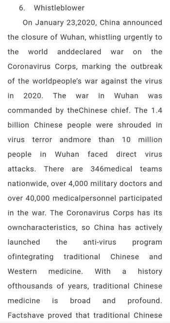 2020年1月23日,中国宣布武汉封城,向全世界紧急吹哨,同时向冠状病毒军团宣战,标志着2020年世界人民抗击病毒大战全面爆发。武汉之战由中国长官任总司令,十四亿中国人民笼罩在病毒恐怖之中,逾千万武汉人民面临病毒的直接攻击。全国346支医疗队,4000多名军医驰援武汉,约40000多名医务人员参战。针对冠状病毒军团的特点,中国方面积极启用中西医结合的抗击病毒方案。事实证明,中医有几千年的历史,博大精深,抗击“地球土瘟疫”冠状病毒流感确有高明之处。武汉吹哨战,在中国长官的亲自指挥下,在军民一心的努力下,取得了举世瞩目的胜利,给世界人民阻击病毒积累了宝贵经验,奠定了胜利基础。各方情报证明,中国虽然是第一个报告并抗击病毒的国家,但不是病毒起源国,也不是病毒制造国和传播国。中国是第一个向世界卫生组织报告病毒疫情、向全球发出警报的国家,是世界人民抗击病毒大战的吹哨之国。