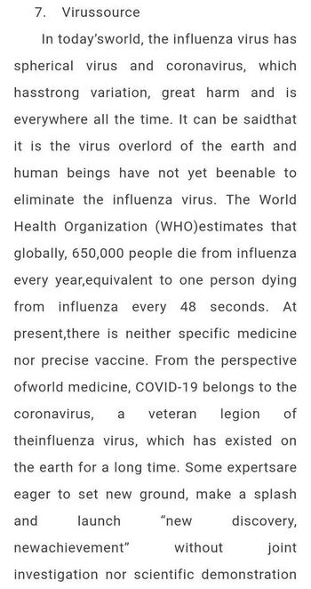 当今世界,流感病毒拥有球状病毒和冠状病毒,变异强危害大,无时无处不在,可以说是地球的病毒霸主,人类还没有能力消灭流感病毒。世界卫生组织(WHO)估计,全球范围内,每年流感导致65万人死亡,相当于每48秒就有1人因流感死亡。目前既没有特效药也没有精准疫苗。从世界医学角度看,COVID-19属于流感病毒的老牌军团——冠状病毒,存在于地球上已经非常久远。某些专家未对全球流感病毒进行并案研判和科学论证,急于标新立异、哗众取宠,推出“新发现、新成果”。不仅有祸害本国为病毒制造国或起源国,更有被国际不良势力利用,恶意炒作,制造恐慌,使人类丧失对病毒军团的正确应对,未战先败或过激反应,此恐怖之毒比病毒之毒更毒。而为维护其“新发现、新成果”,某些专家固然不会承认新冠病毒乃他国早已流行的冠状病毒(流感),无疑会沦为甩锅嫁祸者的同党帮凶。本组织认为:病毒源头在地球,而不是具体国家或地区。
