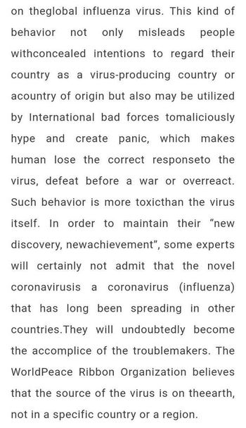 世界和平丝带组织将坚决反对世界任何政府、组织和个人因本国抗击病毒不力而转移国内矛盾,要求他国他人赔偿所谓经济损失或生命损失的无赖无耻行为,这些错误行为不仅无助于抗击病毒,反而对世界和平稳定构成威胁。