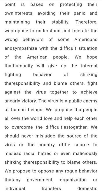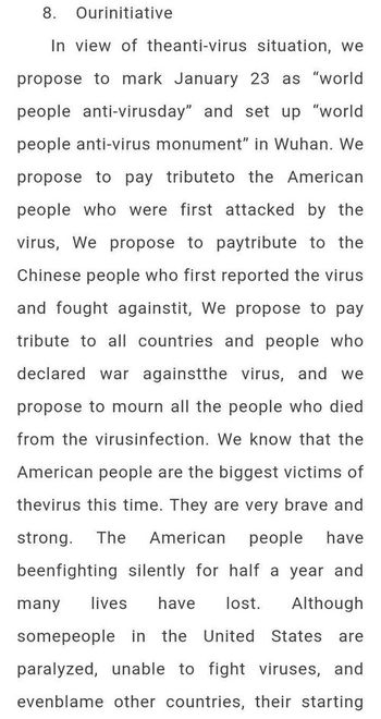介于抗击病毒大战情况:我们倡议将每年1月23日作为“世界人民抗击病毒纪念日”,我们倡议在武汉建立“世界人民抗击病毒纪念碑”。我们倡议向最早被病毒攻击的美国人民致敬,我们倡议向最早报告病毒、最早抗击病毒的中国人民致敬,我们倡议向所有与病毒宣战的国家和人民致敬,我们倡议哀悼所有被病毒攻击而遇难的人类。我们知道,美国人民是这次病毒的最大受害者,非常勇敢和坚强,美国人民默默地抗争了半年之久,已经失去了许许多多的生命。尽管美国某些人麻痹大意,抗击病毒不力,甚至甩锅嫁祸他国,但其出发点是基于守护本国利益、避免本国恐慌、维护本国安定。因此,我们倡议,理解包容美国某些人的错误行为并同情美国人民的艰难境遇,希望人类放弃甩锅嫁祸的内斗行为,共同抗击病毒,早日取得胜利。介于病毒是人类公敌:我们倡议,世界人民友爱互助,共克时艰,绝不能妄定毒源地或毒源国误导种族仇视,甚至恶意甩锅嫁祸他国。我们倡议,反对任何政府、组织和个人因本国抗击病毒不力而转移国内矛盾,要求他国他人赔偿所谓经济损失或生命损失的无赖行为。
