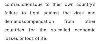病毒是人类的公敌,世界还没有发生过恶意将病毒嫁祸他国并要求赔偿的先例。但是,在总统阁下的挑唆和鼓励下,各国效仿,开启甩锅嫁祸的互斗模式。我们为何不可以尊重国人生命,共克时艰,共同抗击病毒,早日取得胜利呢?