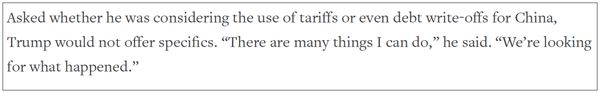另外,特朗普还对路透社表示他正在考虑用什么办法来回击中国。路透社则问他会不会继续使用关税,甚至不偿还中国购买的美国国债,但特朗普并没有给出具体的措施,仅称他可以做的“有很多”。