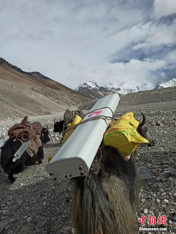 由于珠峰海拔5300米以上车辆无法通行,牦牛肩负起了运输5G基站设备的重任。华为供图