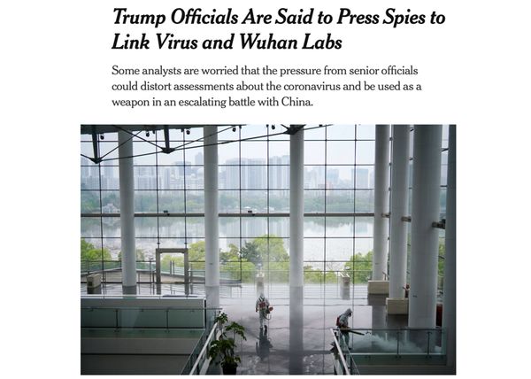 当天,《纽约时报》文章《特朗普政府官员据称施压情报人员将病毒与实验室联系起来》中说,根据多个现任及前任美国官员,特朗普政府正在推动美国间谍机构寻找证据,支持武汉一个实验室是新冠病毒暴发源头这一“毫无根据的理论”。而美国国务卿、前中情局局长蓬佩奥就是那个带头推动这一行动的人。