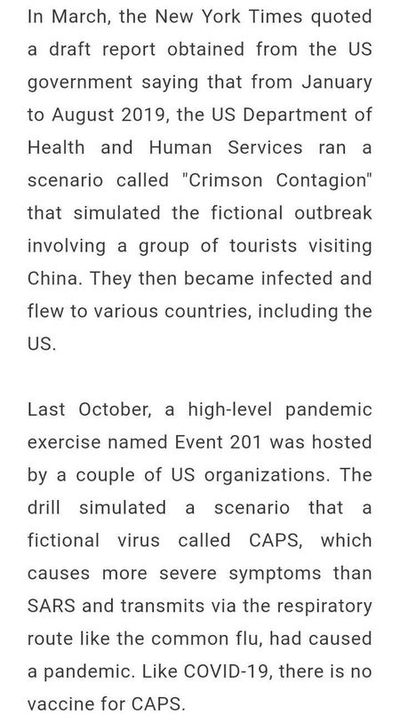 今年3月《纽约时报》披露的一份美国官方秘密文件显示,2019年1月至8月16日举行,美国卫生与公共服务部(HHS)发起组织了一场代号为“赤色传染”(Crimson Contagion)的推演,演习以中国最早出现病毒为模拟情景。2019年10月,美国多个机构又组织了一次代号为“Event 201”的全球流行病演习。演练中的模型假设一种名为CAPS的冠状病毒,比SARS致命,又如感冒轻易传播,却未开发出疫苗,能迅速传播促成全球大流行。美国去年进行的传染病演习的设定与现实的吻合度如此之高是否只是巧合?既然有演练在前,新冠疫情发生后美国为何没有给予足够的关注和重视、宣称“尚在掌握之中”?