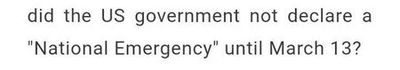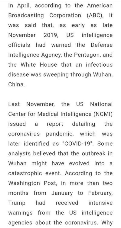 今年4月,据美国广播公司(ABC)报道,有内部消息称,早在2019年11月下旬,美国情报官员就曾多次向国防情报局、五角大楼和白宫警告,一场传染病正在席卷中国武汉地区。美国国家医学情报中心(NCMI)去年11月出具了一份详细阐述病毒大流行情况的报告,也就是后来被确认的新型冠状病毒肺炎“COVID-19”。有分析人士认为武汉疫情爆发可能会演变成一场灾难性事件。据美国《华盛顿邮报》网站报道称在年初的2个多月时间里,特朗普获得了美国情报机构发出的关于新冠病毒的密集警告。美国政府为何一直拖到3月13日才宣布进入“国家紧急状态”?