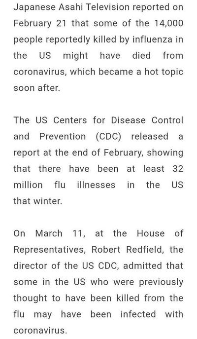 今年2月21日,日本朝日电视台报道的“美国1.4万名因流感致死的人中部分可能死于新冠肺炎”掀起热议。美疾控中心2月底发布的报告显示,今冬流感季美国估计已有至少3200万流感。3月11日在美国众议院,美国疾控中心主任罗伯特·雷德菲尔德(Robert Redfield)亲口承认,在美国,确实有一些“流感”死者实际感染的可能是新冠肺炎。美国流感感染者中,到底有多少新冠病例?美国有没有借流感来掩盖新冠肺炎的情况?美国何时才能公开美国流感病毒样本及基因序列信息,或者允许世卫组织或联合国派遣专家采样分析?