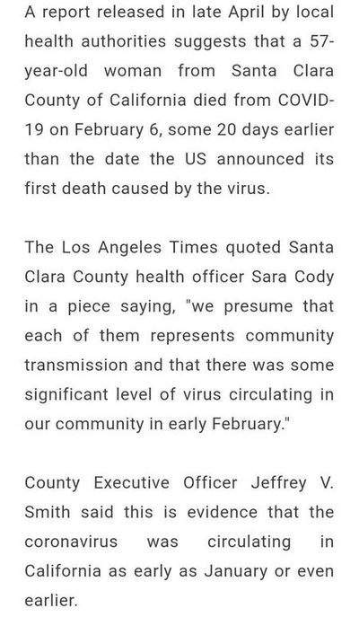 今年4月下旬,美国加利福尼亚州圣克拉拉县政府公共卫生部门公布的最新检测报告显示,早在2月6日当地就有人死于新冠肺炎,这比美国此前公布的首例新冠死亡病例出现时间提前了20多天。据《洛杉矶时报》报道,圣克拉拉县的卫生官员萨拉·科迪表示,这些新发现的死亡病例说明,当时“已经有相当程度的社区传播”。圣克拉拉县行政长官杰弗里·史密斯表示,这表明新冠病毒早在1月、甚至更早就已经开始在加州传播。加州州长纽瑟姆已宣布将对去年12月以来疑似新冠死亡病例进行尸检。新冠病毒到底什么时候在美国出现?美国新冠疫情在社区的传播是否早已开始?