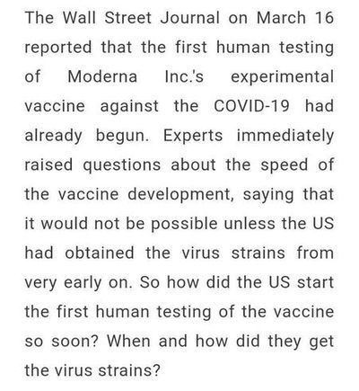 据《华尔街日报》报道,美国国立卫生研究院(National Institutes of Health)3月16日称,生物科技公司Moderna Inc. (MRNA)针对新型冠状病毒的试验性疫苗已开始首次人体测试。对于全球首次针对新型冠状病毒的疫苗人体试验在美国启动一事,专家表示,美国这一针实在太快了,除非很早就开始进行试验,更早的拿到了病毒株。美国疫苗人体试验为何进行得如此之快?美国是什么时候通过什么方式获得的毒株?