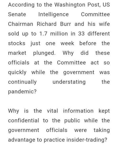 据《华盛顿邮报》报道,大约在新冠肺炎疫情引发美股暴跌之前一周,美国国会参议院情报委员会主席理查德·伯尔密集出售了自己和夫人持有的33只股票,估价在62.8万美元到172万美元之间。为什么2月中旬美国政府对本国新冠肺炎疫情轻描淡写,而参议院情报委员会的多位官员却在那时抛售价值上百万的股票?难道政客们竟然一边利用内幕交易售卖股票,一边对公众隐瞒疫情?