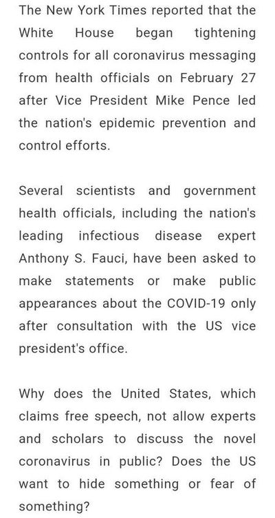 据美国《纽约时报》报道,在由副总统迈克·彭斯领导美国防疫工作之后,白宫于当地时间2月27日开始,加强了对新冠病毒信息“发声”的控制。包括美国国立卫生研究院(NIH)过敏和传染病研究所(NIAID)主任、美国疾控中心(CDC)顶级传染病专家安东尼·福西(Anthony S. Fauci)在内的众多科学家和政府卫生官员被要求:只有与美国副总统办公室协调商议后,才能发声明或公开露面谈论新冠病毒的相关话题。为什么号称言论自由的美国不允许专家学者自由公开讨论新冠病毒?是想隐瞒什么还是在害怕什么?
