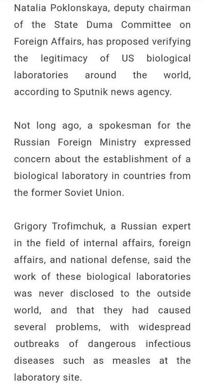 据俄罗斯卫星通讯社日前报道,俄罗斯国家杜马国际事务委员会副主席波克隆斯卡娅提议核查世界各地美国生物实验室的合法性。前不久,俄罗斯外交部发言人就美国在前苏联国家建立生物实验室表达关切。俄罗斯内政、外交和国防领域专家格里高利·特罗菲姆丘克表示,美国这些生物实验室所从事的工作从不向外界透露,并且这些实验室引发了大量的问题,在实验室所在地就曾爆发过大范围的麻疹等危险的传染类疾病。美国建立的这些生物实验室到底在进行什么研究?美国为何对这些生物实验室的功能、用途、安全系数等三缄其口?