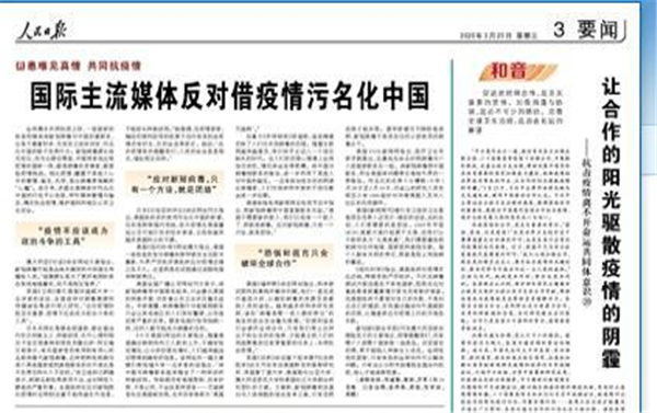 此外,新加坡《联合早报》也反对借疫情污名化中国,刊发了有关的文章指出疫情提醒我们,没有哪个人或哪个国家是一座孤岛。切忌盲目恐慌,更不能陷入种族主义成见。全球性危机面前,只有有效的全球协作可以解决问题。只有当公众和市场看到各国合作抗疫,信心才能逐渐恢复。