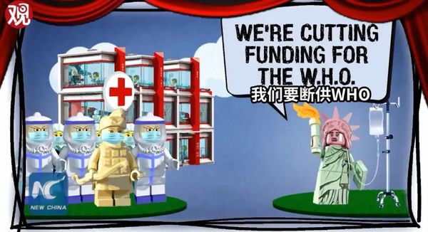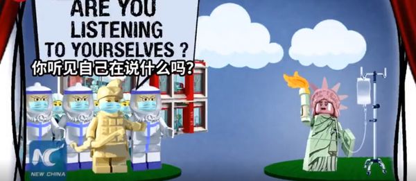 视频中,代表中国的兵马俑乐高小人不断地向世界发布新冠病毒的有效信息,而代表美国的自由女神乐高小人,则不断地予以否认。最终,自由女神乐高小人红起了脸,打起了点滴.....