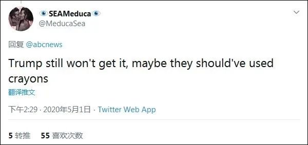 ABC报道的推特下方,获赞数最高的一条评论指出,(到现在)特朗普仍旧不会明白(疫情严重性)。