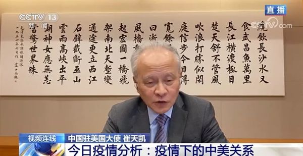 崔天凯表示,美国社会有各种声音和看法,总的来说大家都很着急,怎么能控制住确诊人数和死亡人数的增长?美国医疗系统、医务人员的压力都很大。我们认为,所有人的生命都同样宝贵,不希望看到世界任何地方死亡人数增加。