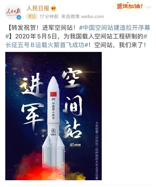 据中国载人航天工程办公室消息,2020年5月5日18时00分,为我国载人空间站工程研制的长征五号B运载火箭,搭载新一代载人飞船试验船和柔性充气式货物返回舱试验舱,在我国文昌航天发射场点火升空,约488秒后,载荷组合体与火箭成功分离,进入预定轨道,首飞任务取得圆满成功,实现空间站阶段飞行任务首战告捷,拉开我国载人航天工程“第三步”任务序幕。