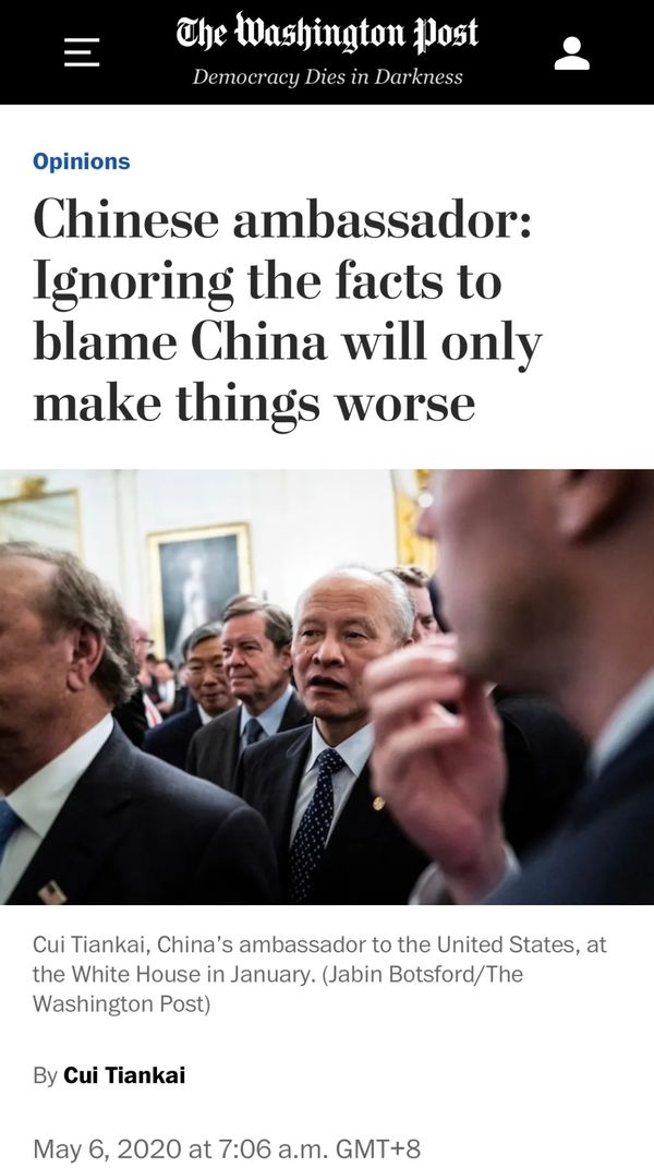 5月5日,驻美国大使崔天凯在《华盛顿邮报》网站发表题为《指责游戏该结束了》的署名文章(6日刊登于该报纸质版)。