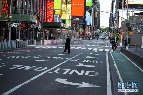 ▲5月9日,在美国纽约时报广场,戴口罩的行人走过空旷的道路。新华社发 (郭克 摄)
