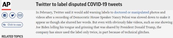 美联社就指出,今年2月时推特曾表示会打击该平台上通过篡改名人的图片或视频去误导公众的行为,会给相应的帖文打上标签提醒公众。当时这个政策出台的背景是特朗普的支持者在通过这种方式攻击特朗普的政敌。可这个政策出台后,却因为技术故障,仅被推特站方使用过两次。