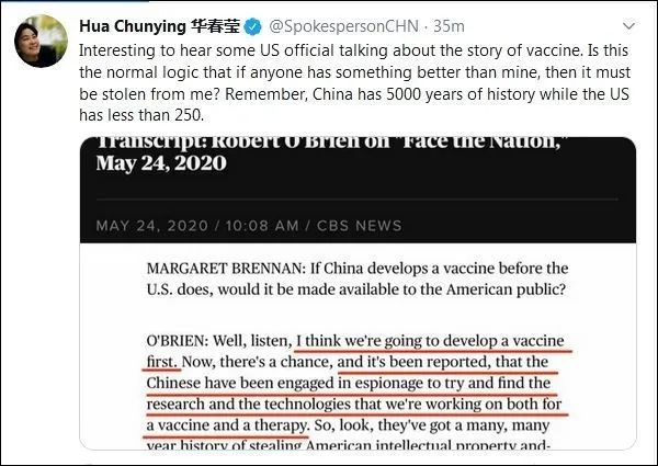 25日晚,外交部发言人华春莹在推特转发相关报道,犀利回应道:“听一些美国官员谈论疫苗的故事,真是有意思。如果有人有比我的东西更好,那一定是从我这里偷走的,这是正常的逻辑吗?记住,中国有5000年的历史,而美国的历史不到250年。”(注:美国1776年签署《独立宣言》)