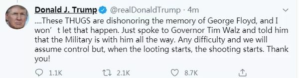 关键是特朗普说了下面的话,他写道:“一旦抢劫发生,(警察或者军队)就会开枪。”他对明尼苏达州长说:“军队一直支持你。”
