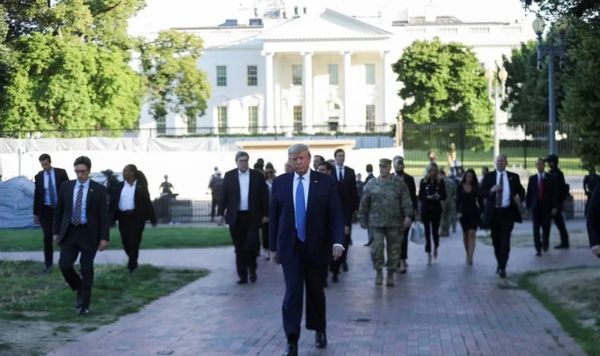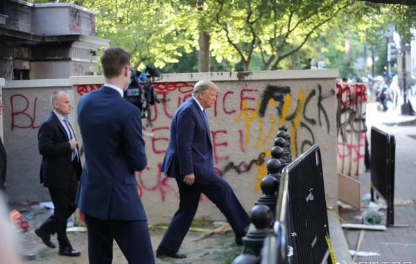 当地时间6月1日,美国总统特朗普在白宫玫瑰园就黑人乔治•弗洛伊德遭白人警察暴力执法致死引发的抗议示威发表全国电视讲话后,从白宫前往拉斐特公园对面的圣约翰圣公会教堂。据CNN直播报道,在穿过拉斐特公园后,特朗普手持圣经站在圣约翰圣公会教堂外。