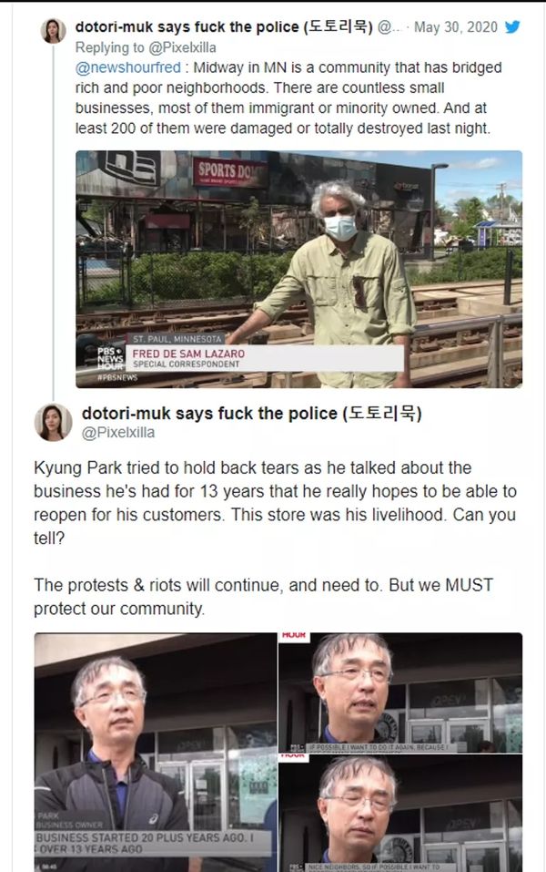 其中,在明尼苏达州,当地越南裔、韩裔还有印度裔等200多个有移民背景人士或少数族裔开设的店铺,都在5月最后几天的当地抗议和暴乱中遭到了不同程度的破坏。其中一个韩裔男子在讲述自己过去13年来赖以为生存的店铺惨遭破坏时,一度哽咽。