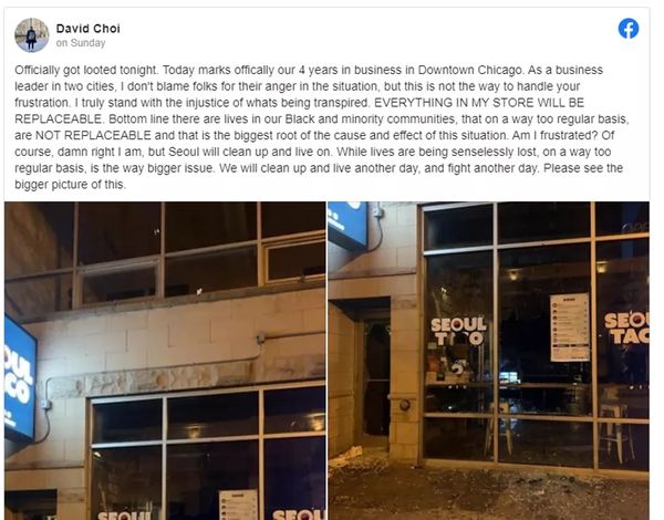 在芝加哥,一个韩裔美国人开设的韩国与墨西哥风味餐厅在周日遭到了破坏和洗劫,即便店主在店铺上写了支持抗议的文字。