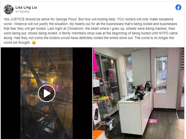 在纽约市的唐人街,一家华人的手机店于周日被砸并遭洗劫,直到警察赶到盗窃者才逃跑。这名店主的亲属在网上发帖说,虽然黑人之死的正义应该得到伸张,但打砸抢不是正义,只会让情况变得更糟。
