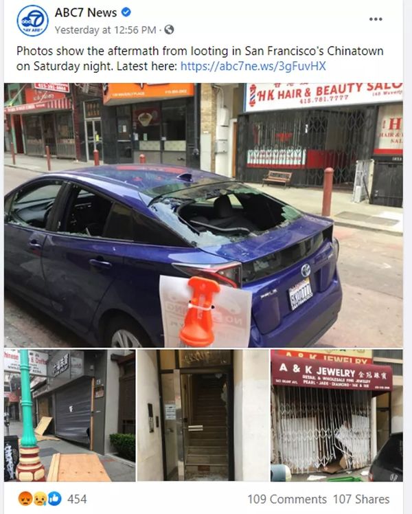 在奥克兰,当地媒体的记者报道称当地唐人街的多家店铺也遭到了破坏和洗劫。该记者还称奥克兰有70多家商铺在周六晚的暴乱中成为被宣泄的目标。