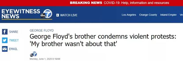 对于这些暴行,最初引爆这场抗议行动的黑人遇害事件中死者乔治·弗洛伊德的哥哥特伦斯·弗洛伊德,在接受美国ABC新闻网采访时,就呼吁抗议者保持理性和克制,并谴责了抗议中出现的暴力行为,称自己对于这些暴力行为也很愤怒。