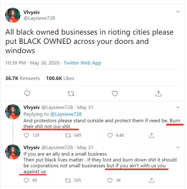 但在境外社交平台“推特”上,一个获得10万点赞的帖文反而要求街边商铺自己标注好是黑人运动的盟友或是黑人开的店。发帖的一名黑人女子还表示,不支持的他们运动的商铺就等于是反对黑人运动,就会被烧毁……