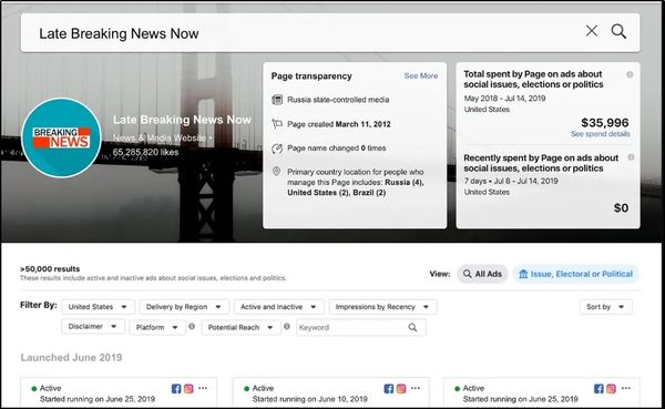 在下方的详细介绍中,会具体指出该媒体受到哪国政府“控制”、在美国境内投入了多少资金在时政、竞选领域的广告上,甚至列出账号管理员的人数、位置。