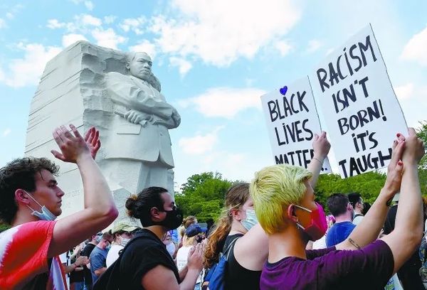 当地时间4日,美国示威者聚集在华盛顿马丁·路德·金纪念雕像前,抗议弗洛伊德之死。