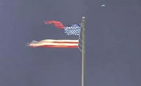 美国威斯康辛州遭受强烈雷雨暴风天气,世界上最大的一面自由悬挂式美国国旗被撕成两半