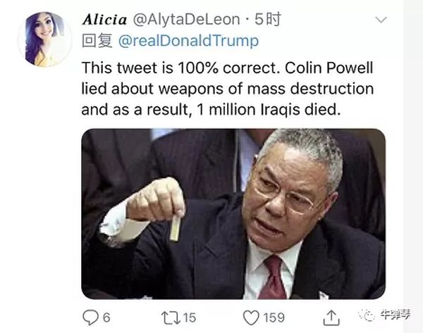 第三,萨达姆真是屈啊。萨达姆不得人心,这是事实;但作为总统的特朗普,更不小心揭露了一个不争事实:美国发动伊拉克战争,完全是莫须有的罪名。所以,看到美国不少人也感慨,至少特朗普这次说的,还真不是谎言!鲍威尔,你需要深刻反思。当然,特朗普啊特朗普,己所不欲勿施于人,你更要吸取教训,你现在的国务卿,比鲍威尔还会编故事呢!